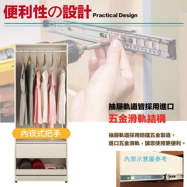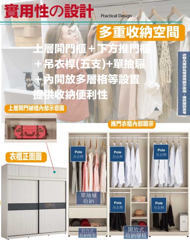採用下層推門衣櫃+上層開門被櫥櫃+吊衣桿+單抽屜+拉合式層架+內開放層格等收納空間設計