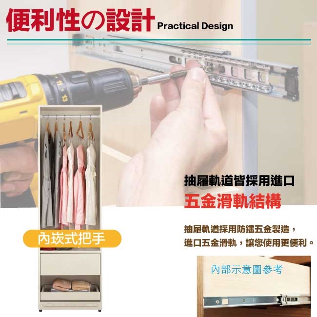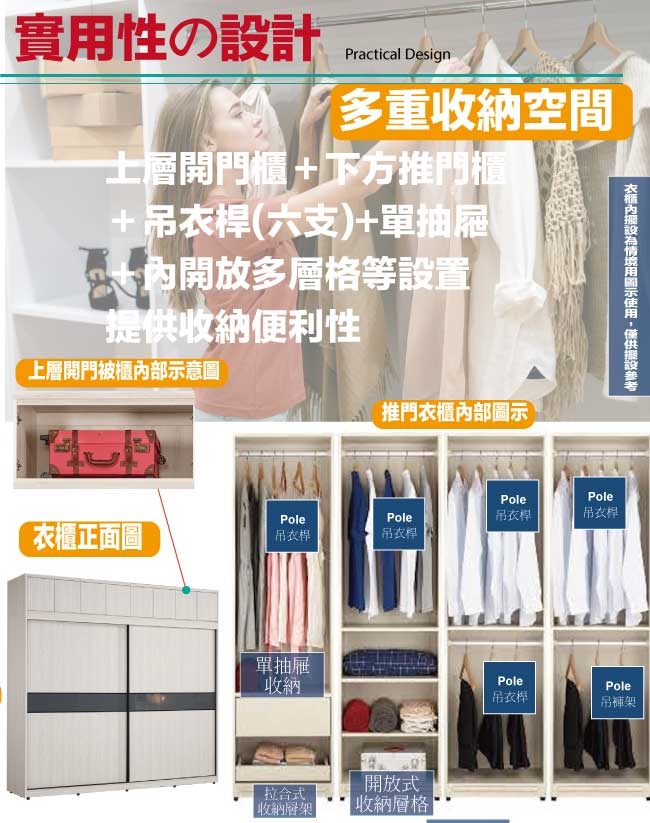 採用下層推門衣櫃+上層開門被櫥櫃+吊衣桿+單抽屜+拉盤層架+內開放層格等收納空間設計