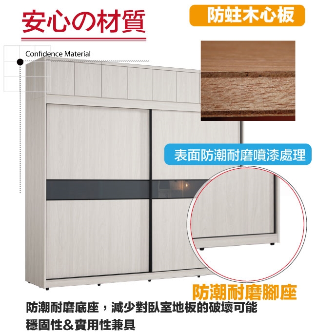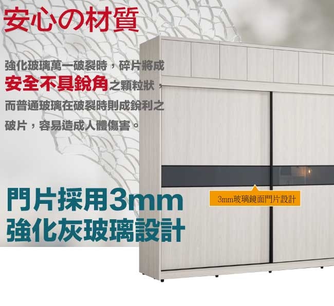 採用防蛀木心板+防潮耐磨腳座+五金滑軌結構+5mm強化灰漆強化灰漆玻璃門片飾板+防夾手緩衝門片五金等安心材質製造