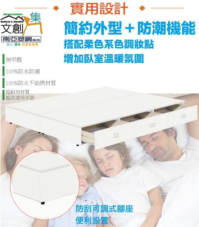 【文創集】柯瑞 南亞塑鋼高強度5尺雙人側三抽床底 產品採用第一品牌-台製南亞塑鋼舒美板材質,整體材質採用防水+防燃+無甲醛安心南亞塑鋼舒美板+南亞18mm中空硬殼發泡板(耐重200kg以上)+防刮可調腳座等材質製造 ,床底為側單邊開合三抽屜收納設計,防止受潮,增加支撐力,堅固不會塌陷,全由專人配送到家,專業安心服務,替你省下更多時間!