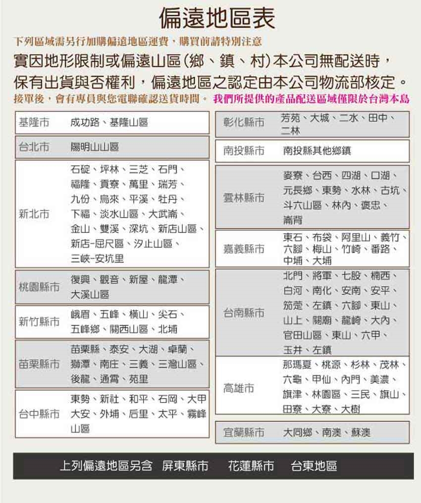 1.實因特殊地型限制及(山區、濱海鄉、鎮、村、區)無法送貨時,本公司保有出貨與否之權利(下單後會由專人告知是否可配送)。