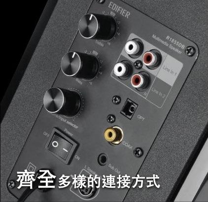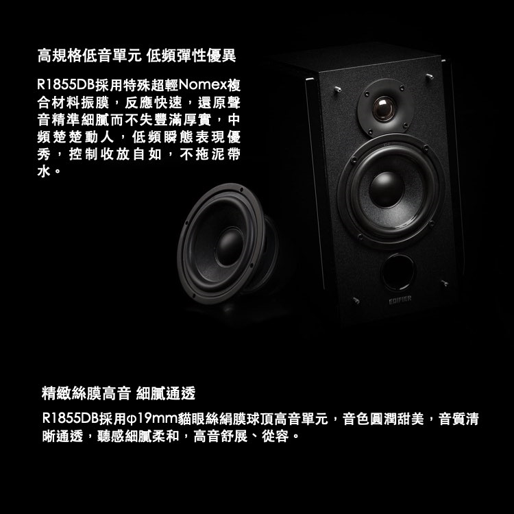 R1855DB具有藍牙、光纖、同軸、RCA等多種訊源輸入,以及外接重低音接口,豐富的接口可以連接家裡幾乎所有的訊源,4吋Nomex複合材料振膜,質量輕,動態響應十足而不是細節,φ19mm絲絹膜球頂高音單元,音色圓潤甜美,解析力和細節表現上乘,略帶仰角的箱體設計,處處彰顯專業風範,基於先進的DSP分音電路,大大降低了整套系統的失真,聲音表現更加全面、穩定,R1855DB堪稱2.0桌面書架喇叭的巔峰之作