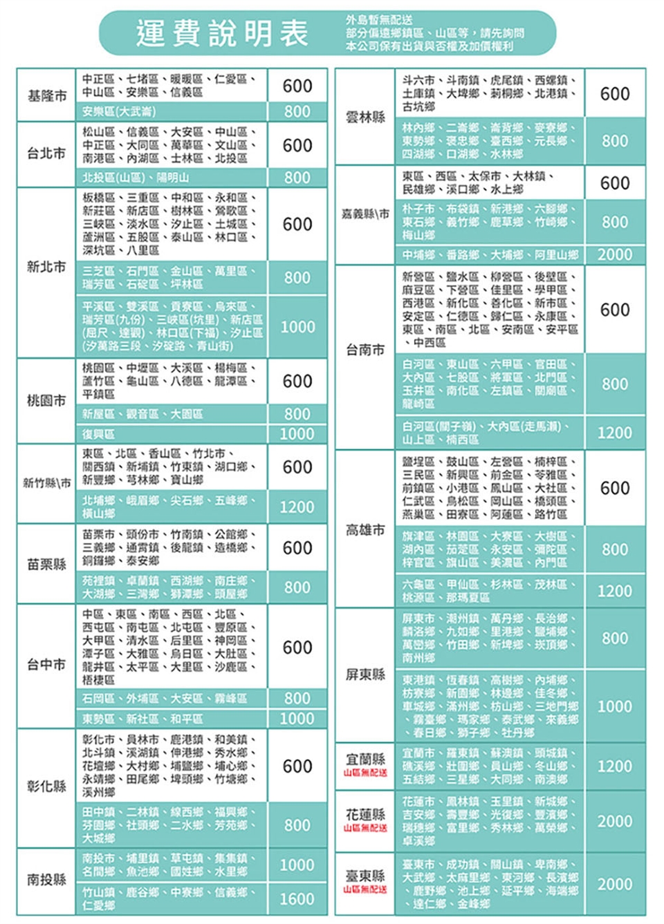 大型貨運運費說明請參考下方說明圖表,請確認同意再下單購買!