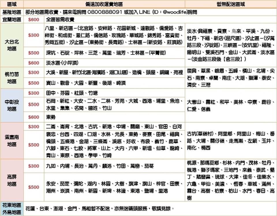 8.由於全台路段眾多,運費表未納入之地區路段,如經由物流回報需加收,本司亦保有加價之權利。