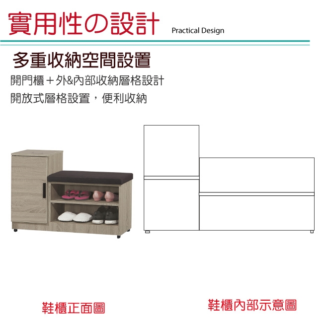 採用開門櫃+內&外開放層格+穿鞋椅凳設置等收納空間設計