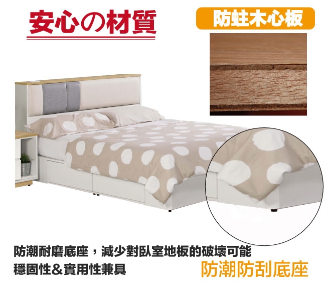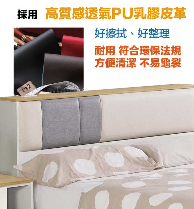 採用防蛀木心板+六分木床板+防潮耐磨腳座+透氣乳膠皮革+高密度泡棉等安心材質製造