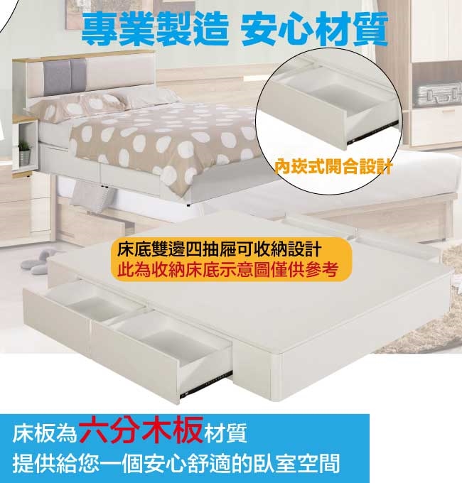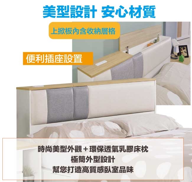 搭配採用可掀式床頂板+內開放收納層格+便利充電插座設置+床底雙邊開合四抽屜等收納空間設計