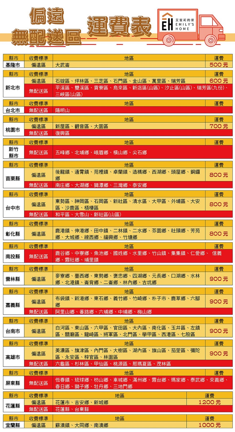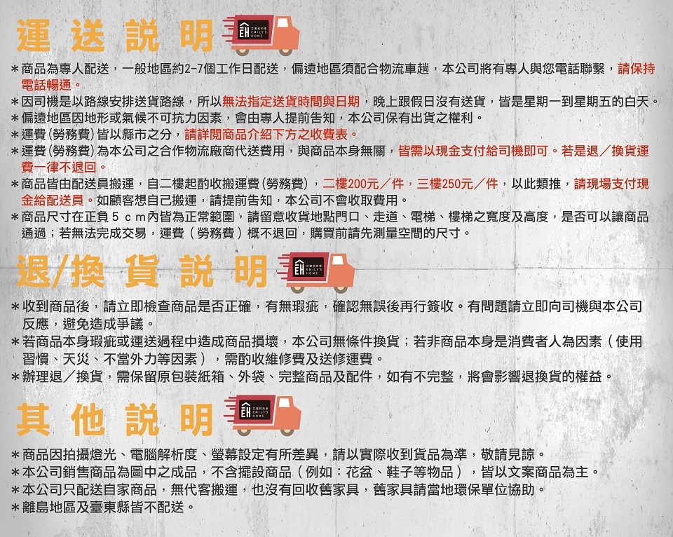 ▲本公司只配送自家商品,無代客搬運,也沒有回收舊家具,舊家具請當地環保單位協助。