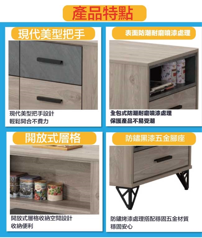 採用正面&側邊共五抽屜+開放式收納等收納空間設計