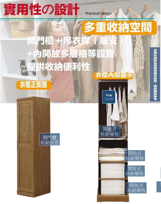 搭配採用開門櫃+吊衣桿+內開放層格等收納空間設計