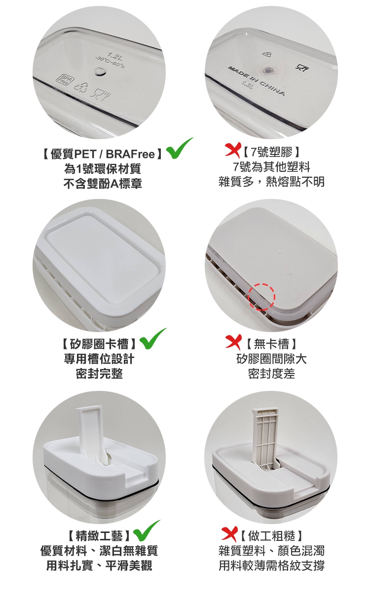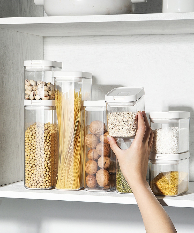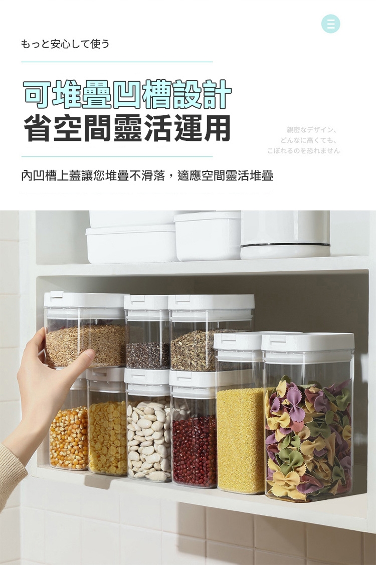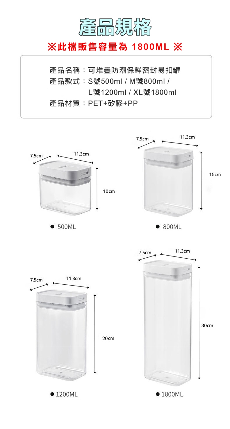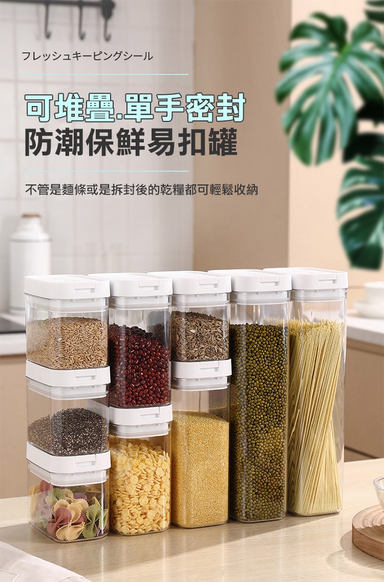 市售易扣罐有諸多不便嗎?密封麻煩、上蓋不緊、彈性疲乏、無法堆疊?試試這款可堆疊防潮保鮮密封易扣罐,新結構設計密封鎖扣,快速省力單手快速開合密封;加厚緊密矽膠圈,裝水倒放也不外漏,有效密封加厚耐用不易變形;可堆疊凹槽上蓋設計,堆疊省空間,靈活堆疊適應各種不同收納空間;採用高透亮PET材質,讓您時時刻刻掌握乾糧剩量,食品用材質不含雙酚A,加厚瓶身真耐摔;多款尺寸可挑選~廚房必備的食物保鮮盒!