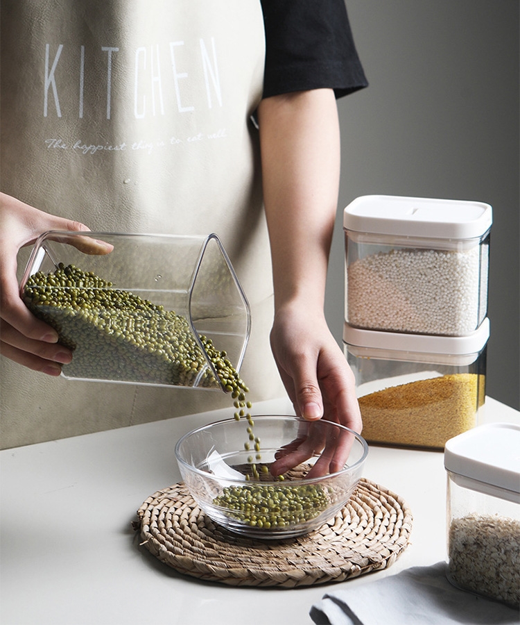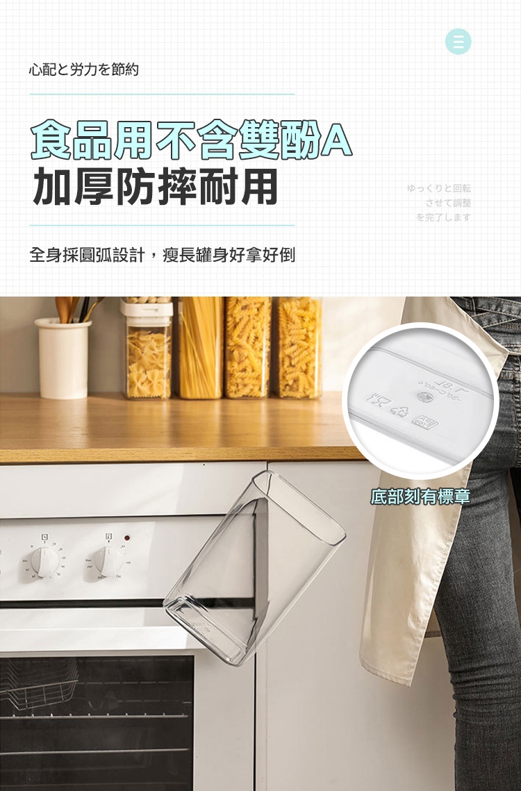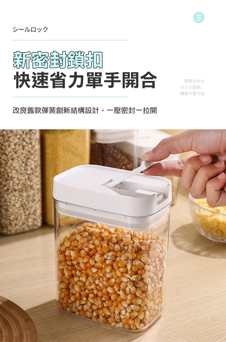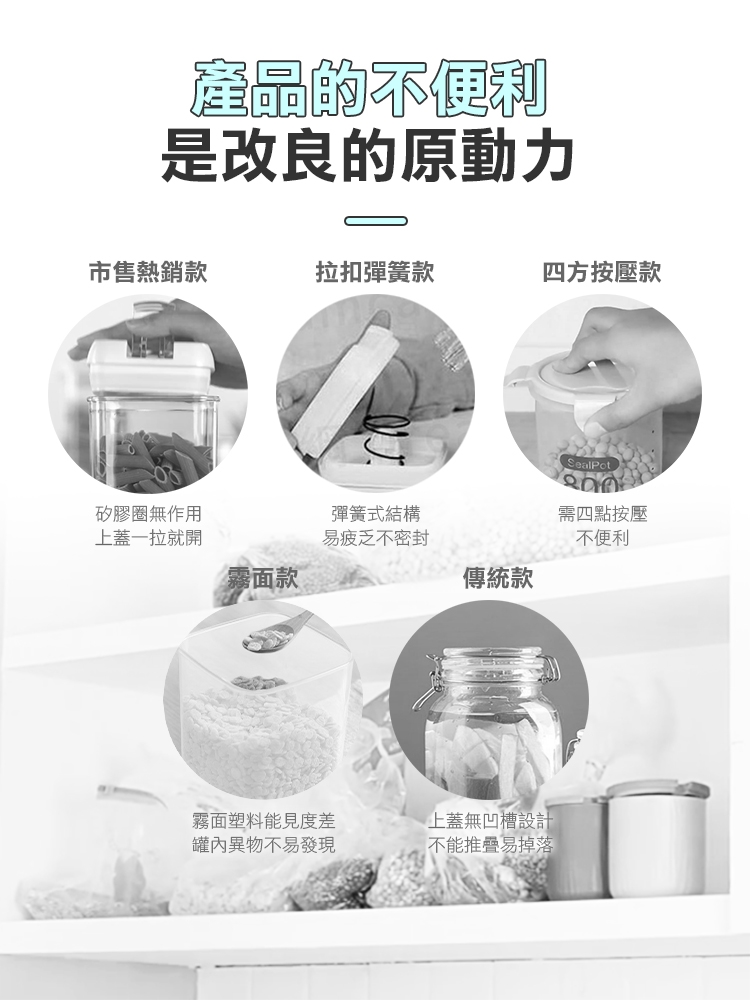 市售易扣罐有諸多不便嗎?密封麻煩、上蓋不緊、彈性疲乏、無法堆疊?試試這款可堆疊防潮保鮮密封易扣罐,新結構設計密封鎖扣,快速省力單手快速開合密封;加厚緊密矽膠圈,裝水倒放也不外漏,有效密封加厚耐用不易變形;可堆疊凹槽上蓋設計,堆疊省空間,靈活堆疊適應各種不同收納空間;採用高透亮PET材質,讓您時時刻刻掌握乾糧剩量,食品用材質不含雙酚A,加厚瓶身真耐摔;多款尺寸可挑選~廚房必備的食物保鮮盒!