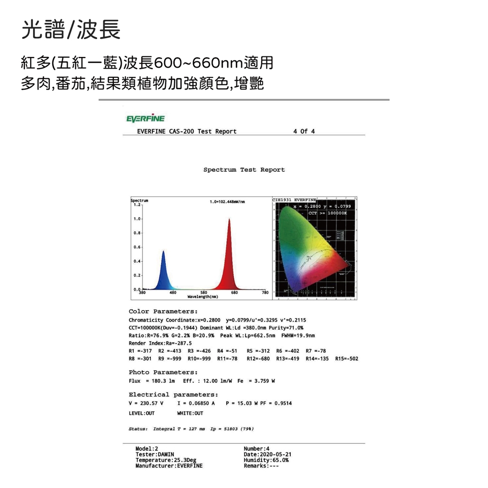 - 紅多(五紅一藍)波長600~660nm適用多肉,番茄,結果類植物加強顏色,增艷,果實增產,延長花期