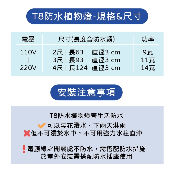 ▸T8植物燈生活防水,可以澆花淋雨,不能浸水或強力水柱