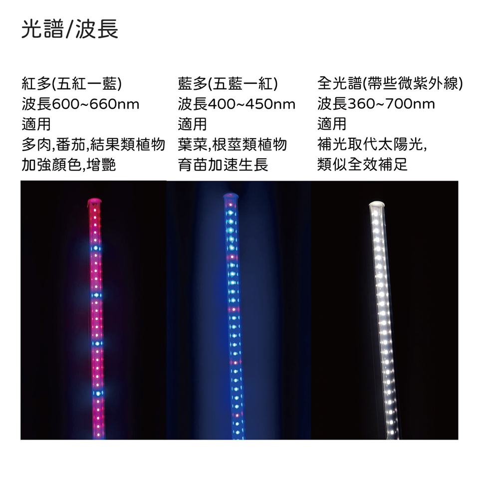 - 全光譜(帶些微量紫外線)波長360~700nm適用補光取代太陽光,類似全效補足,適合各式蔬果跟水草缸使用