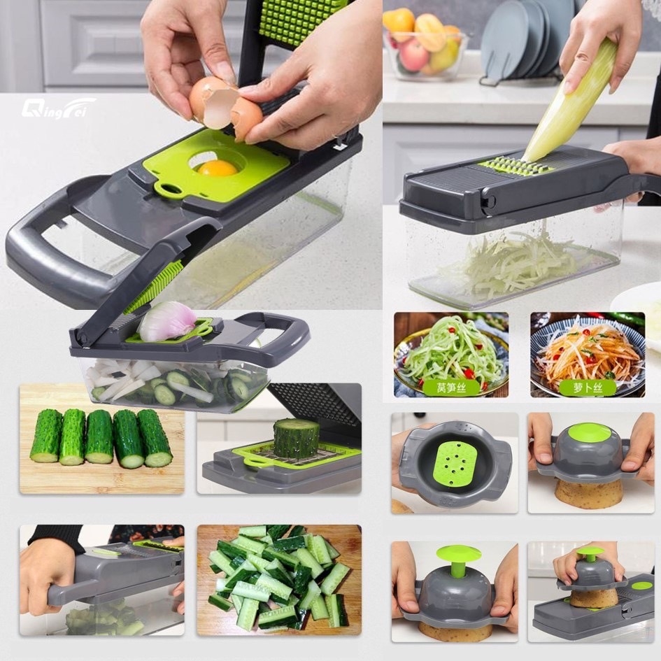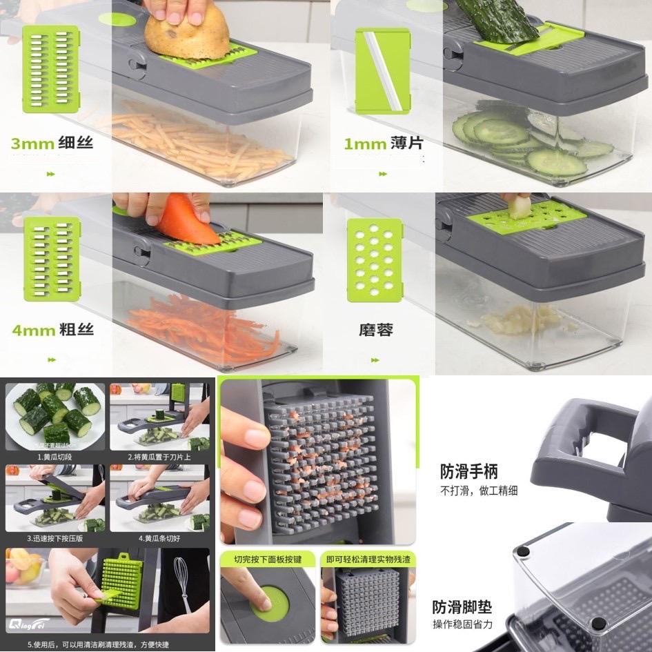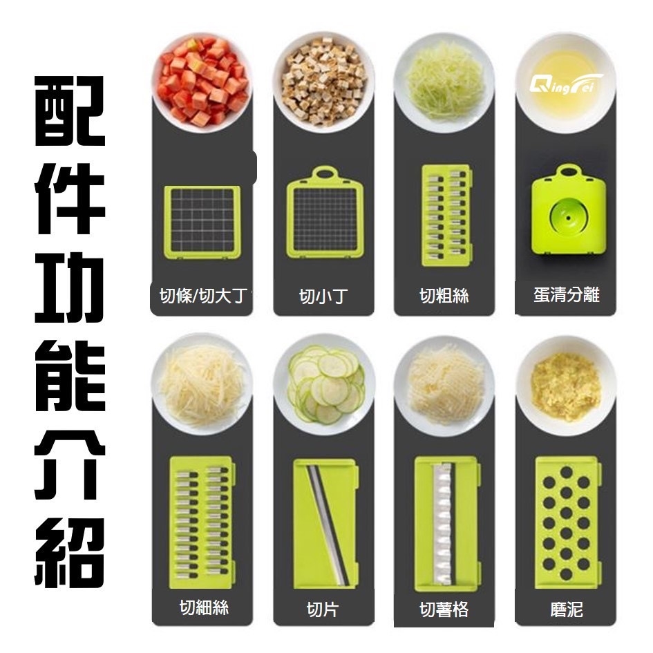 包裹包含:切菜刨絲器本體 + 7個刀片 + 清潔刷 + 護手器 + 瀝水籃 + 壓板