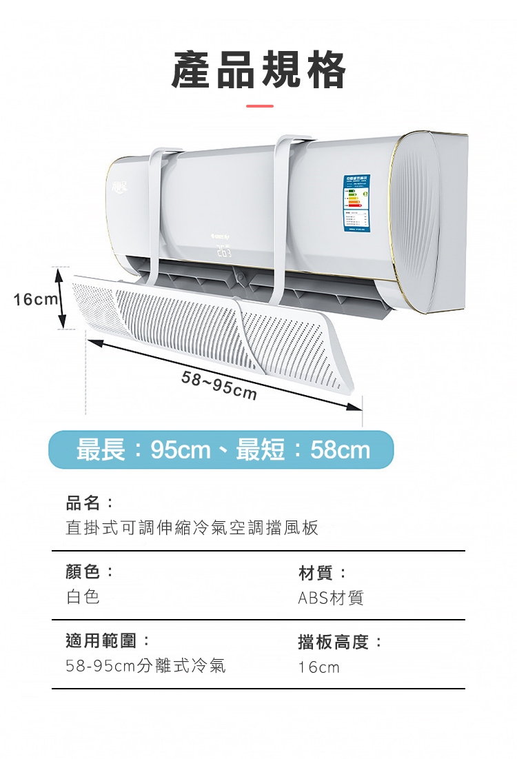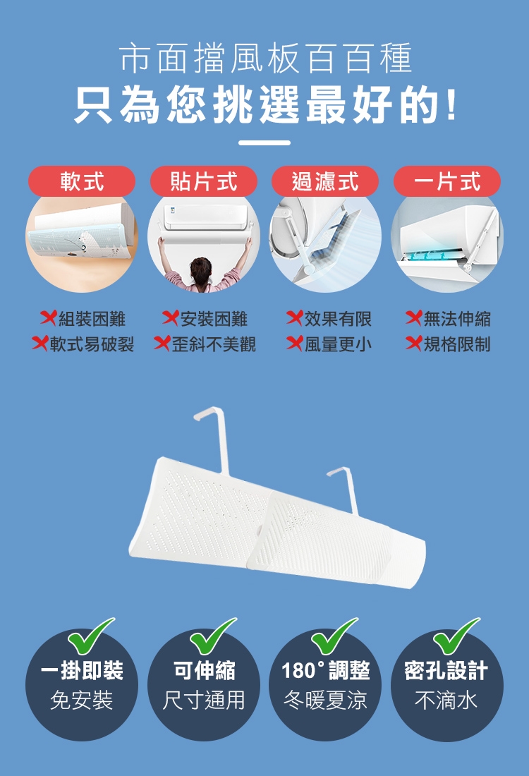 為了避免冷氣直吹的困擾,你的冷氣空調板好用好安裝嗎?市售軟式易破裂,寬度有限無法伸縮,安裝麻煩不平穩,推薦你"最超值便利空調板"直掛式可調伸縮冷氣空調擋風板",大伸縮55至88cm皆可安裝,便利直掛式快速安裝,省去麻煩費時安裝過程,多角度可調,搭配多孔透氣密孔,不易凝水滴水,特選ABS材質穩固又平穩,這麼超值冷氣空調板你還在等什麼!