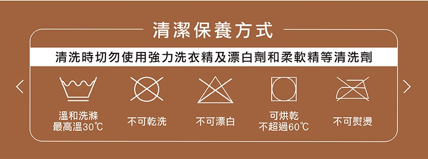 清洗時切勿使用強力洗衣精及漂白劑和柔軟精等清洗劑