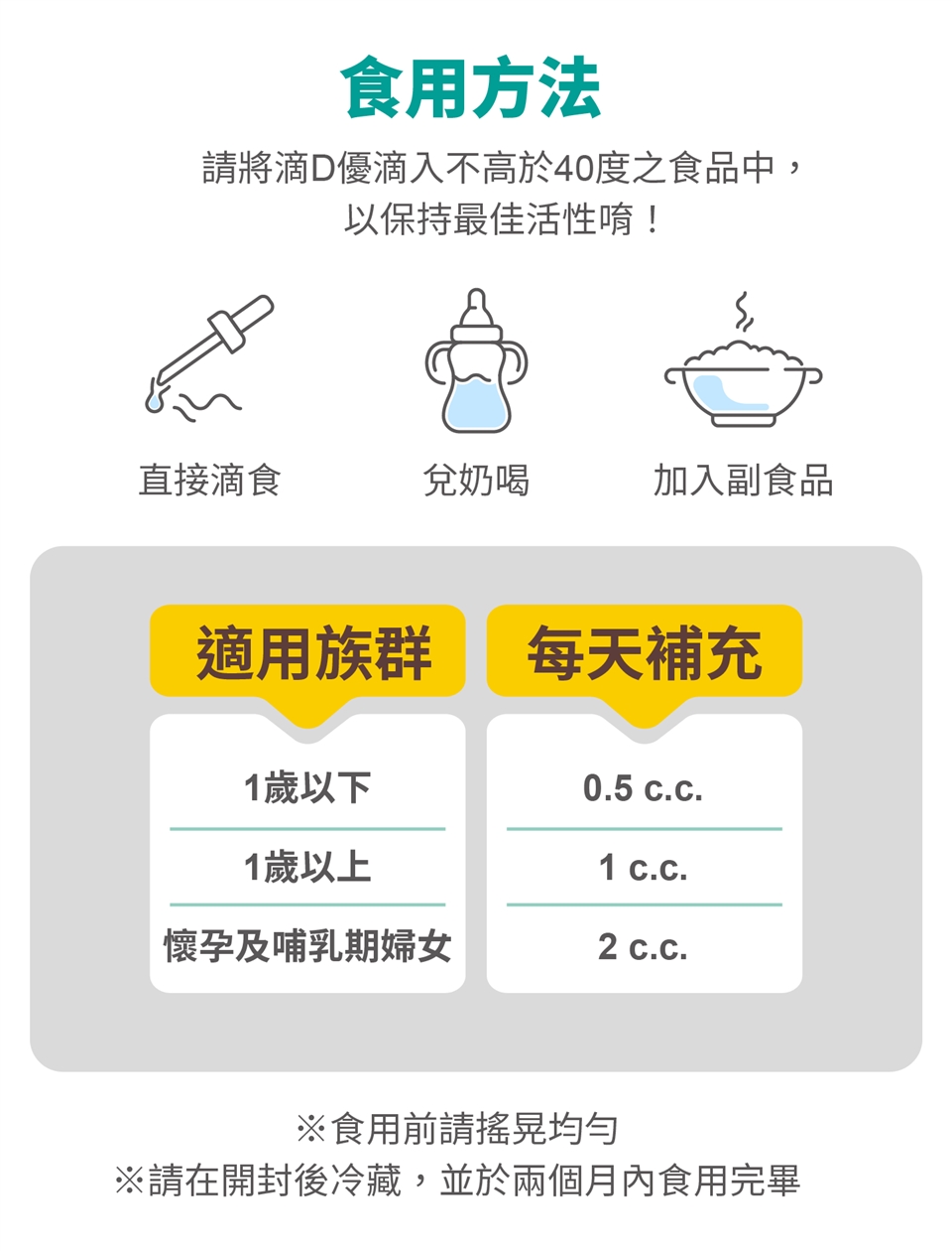 商品詳細介紹 體驗說明 不可體驗 使用方法說明 1歲以下每日0.5ml;每一份量0.5毫升 1歲以上每日1ml;懷孕及哺乳期婦女每日2ml或依循專業人員建議方式食用 (適量攝取,多食無益) 注意事項 適量攝取,多食無益