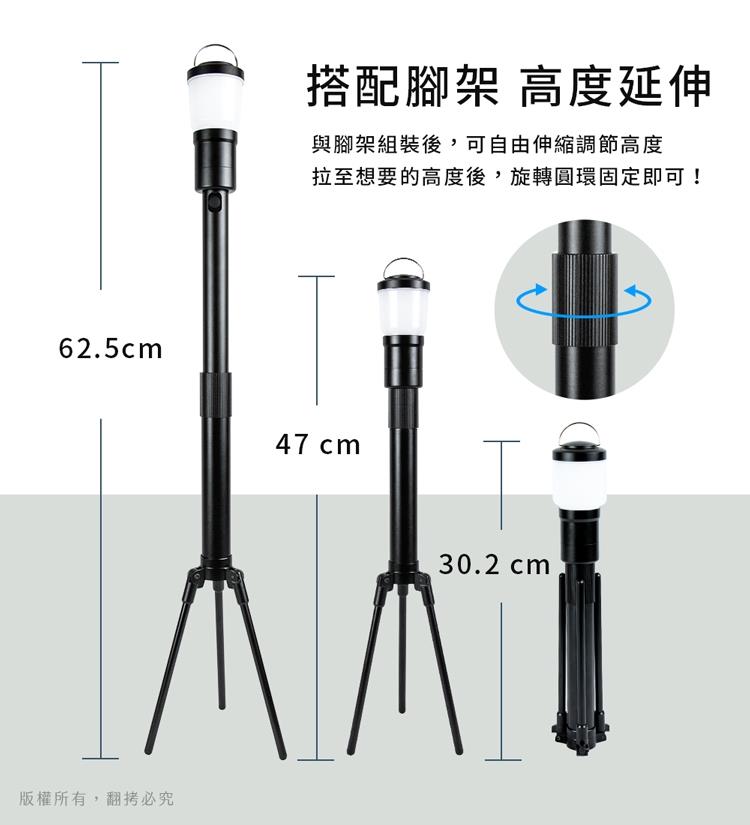 搭配伸縮式腳架,穩固立放於平面上,可當戶外露營燈,