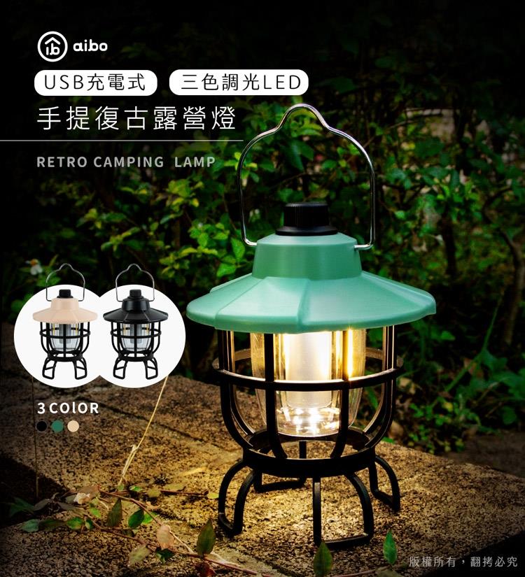 aibo USB充電式 三色調光LED 手提復古露營燈(LI-59)