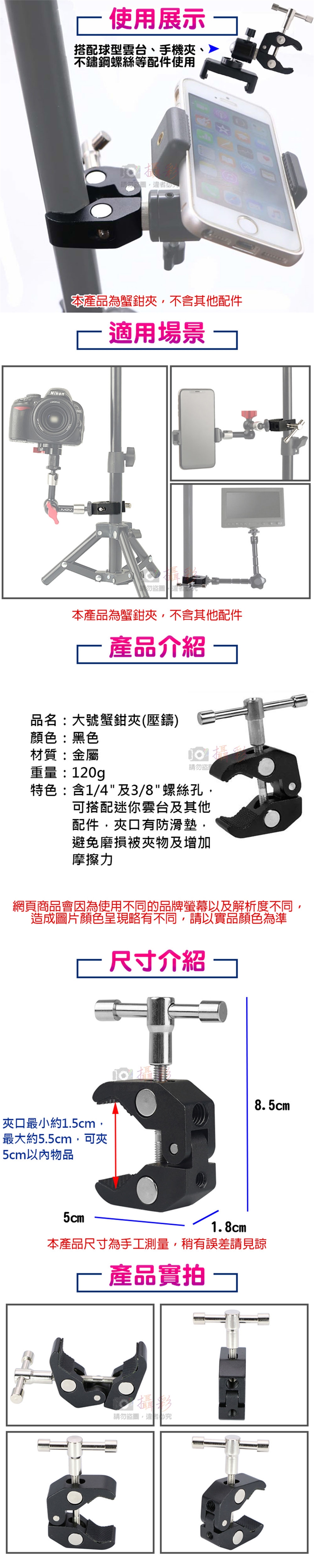 特色:含1/4"及3/8"螺絲孔,可搭配迷你雲台及其他配件,夾口有防滑墊,避免磨損被夾物及增加摩擦力