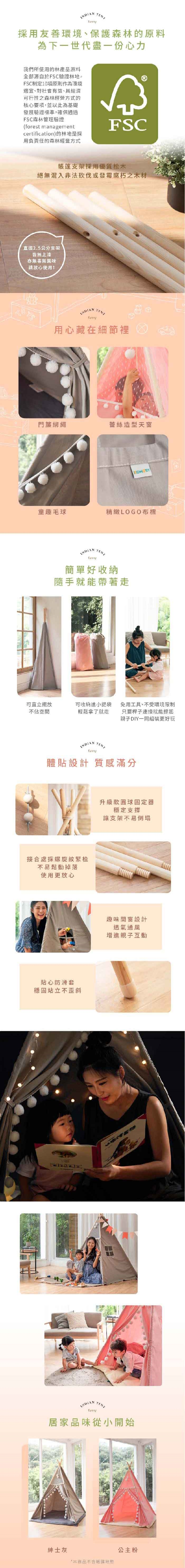 內容物:松木桿X16、帳棚布、收納袋、連接管X12、圓球固定器、防滑腳套X4、裝飾毛球