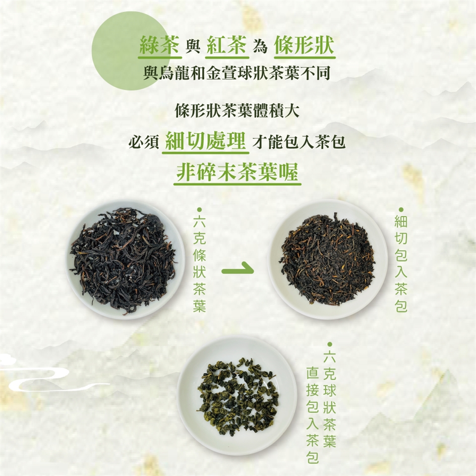 *茶多酚綠茶、電波紅茶屬條狀茶葉,為包入茶包中,將其細切