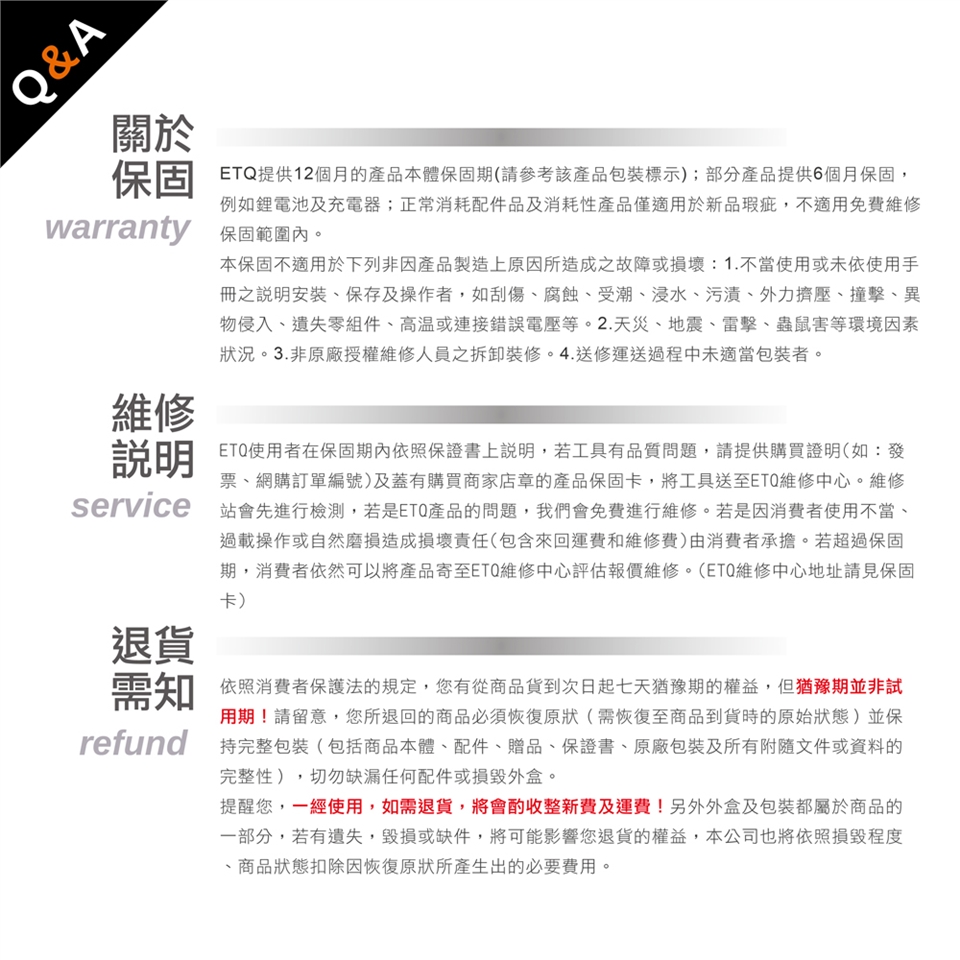 ETQ提供12個月的產品本體保固期(請參考該產品包裝標示);部分產品提供6個月保固,例如鋰電池及充電器;正常消耗配件品及消耗性產品僅適用於新品瑕疵,不適用免費維修保固範圍內。