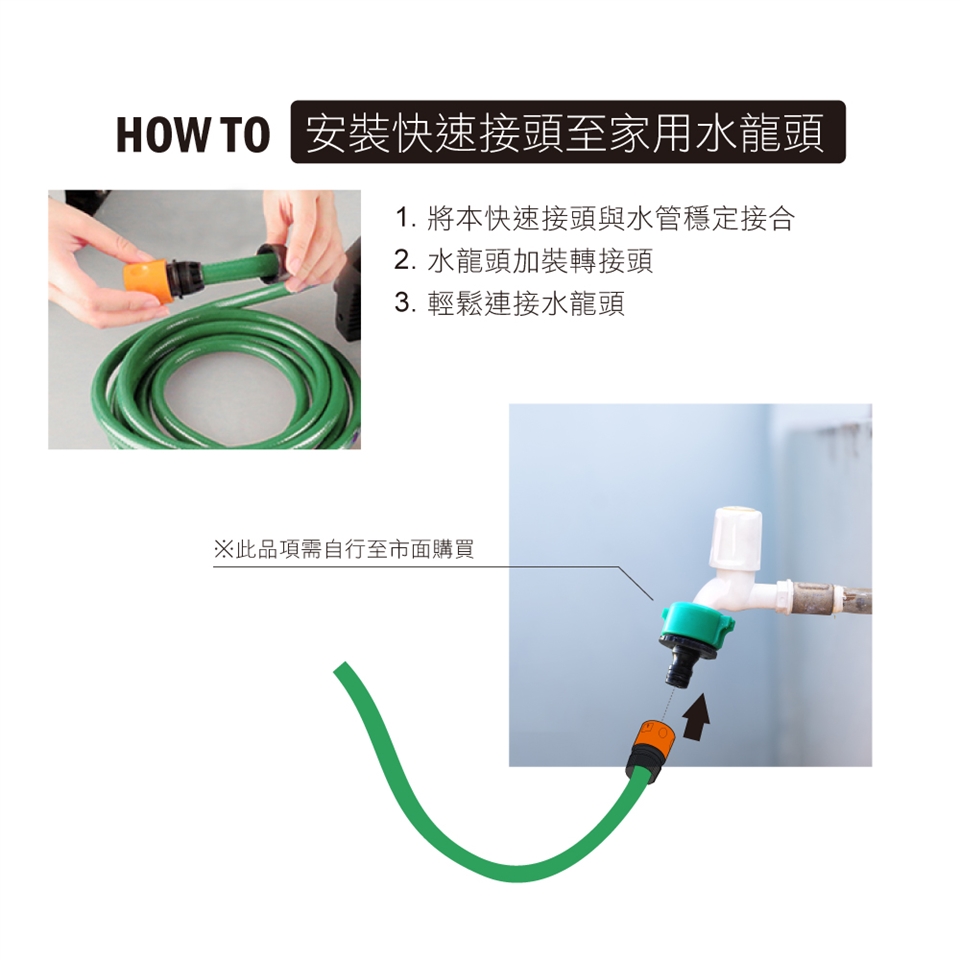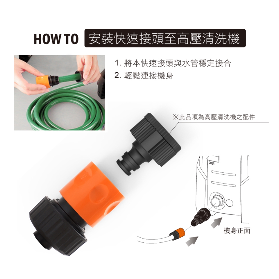 可銜接高壓清洗機進水孔,或家用水龍頭(需自行加裝對應配件)