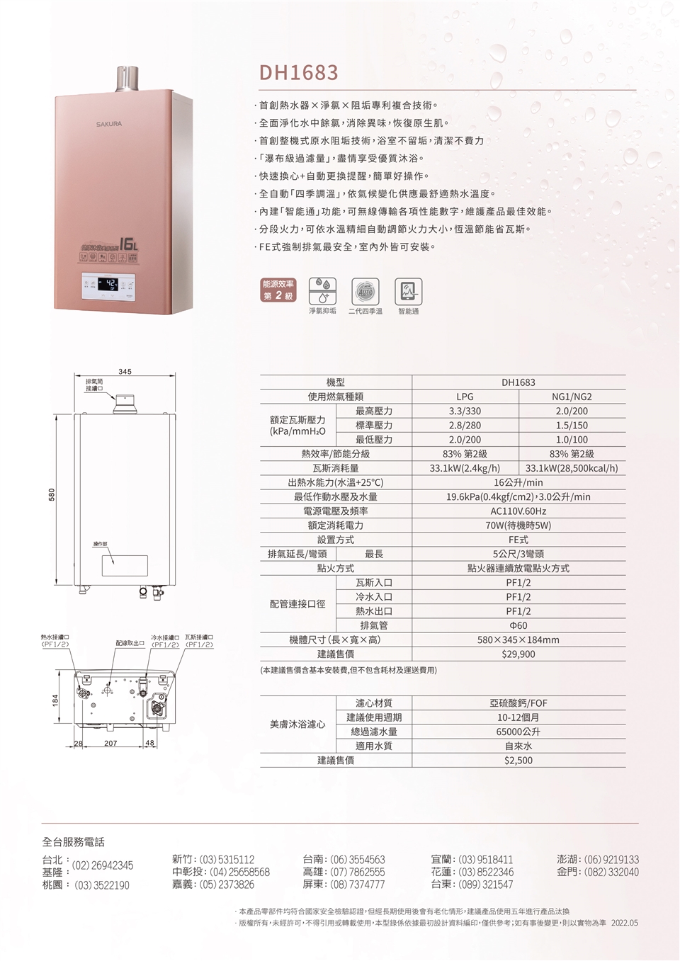 *強排氣熱水器超出標準安裝的管材需依照現場環境計價,安裝需要有110V的插座,若現場無插座或距離較遠請"自備"延長線或轉接頭,原廠技師不會協助接電線、準備延長線