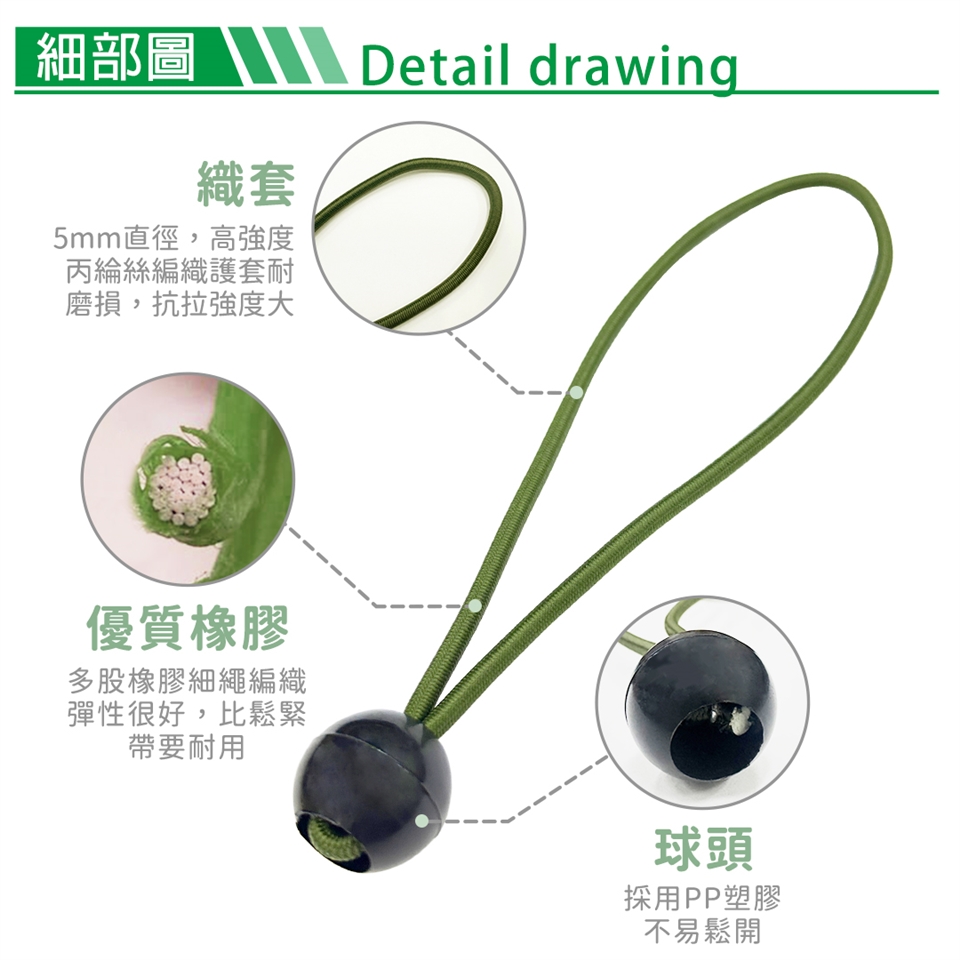 ◆ 利用彈性繩伸縮特性加上固定圓球的搭配組合,快速綑綁或是鬆綁。