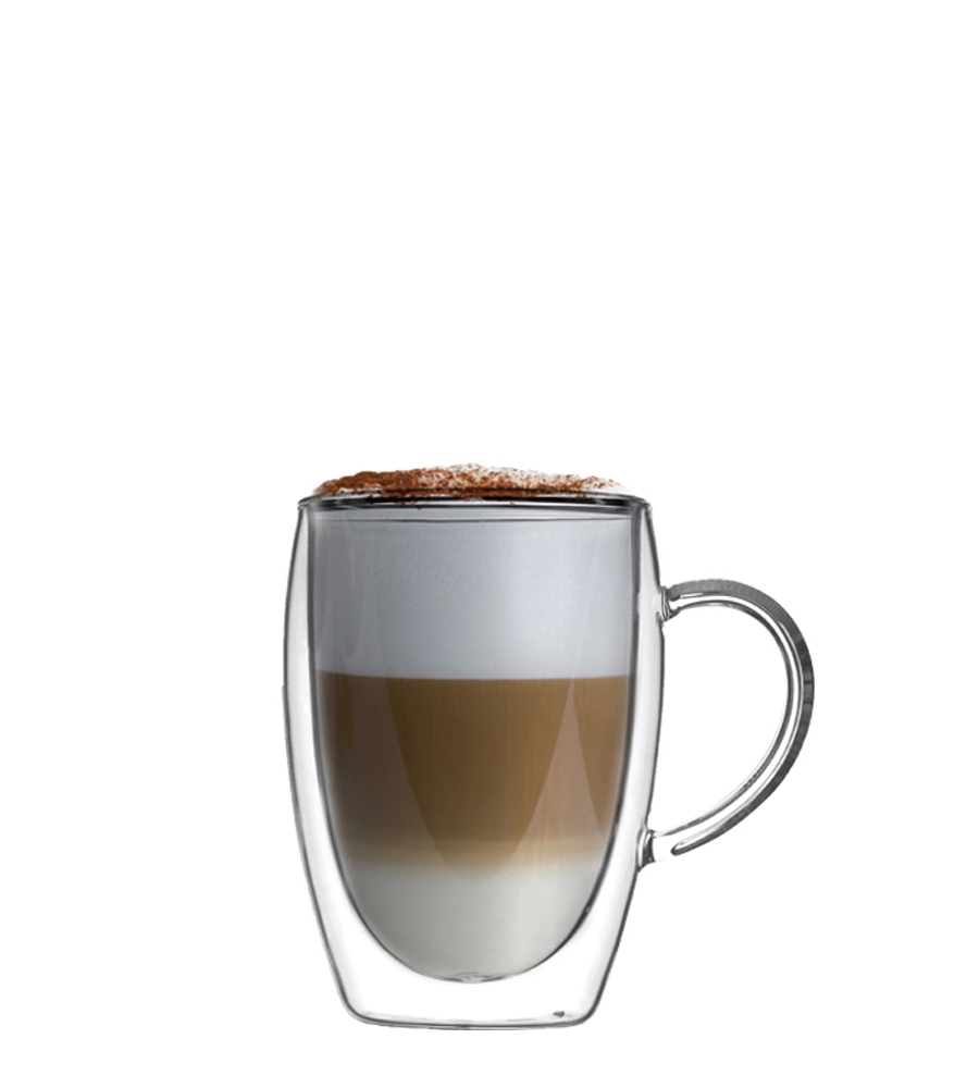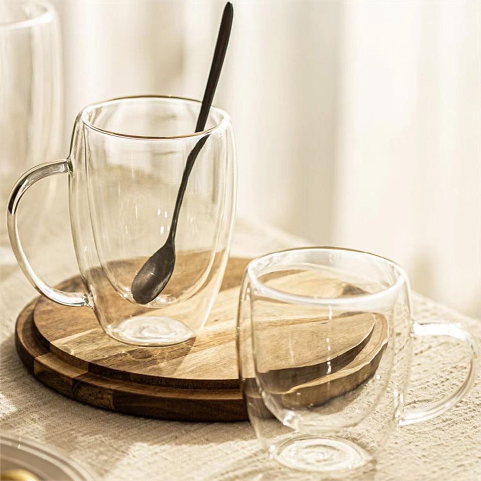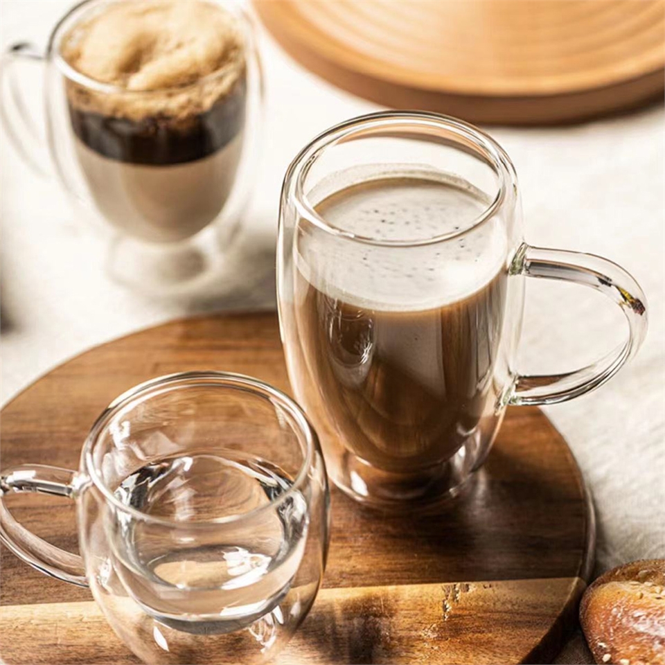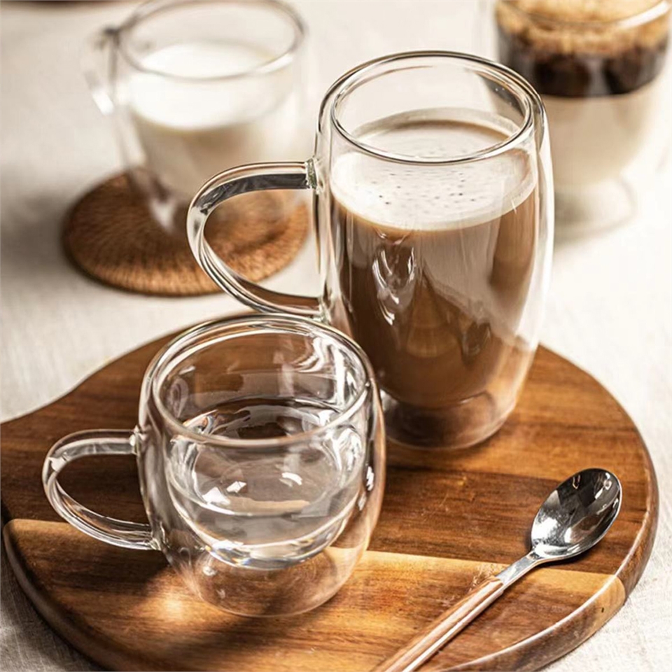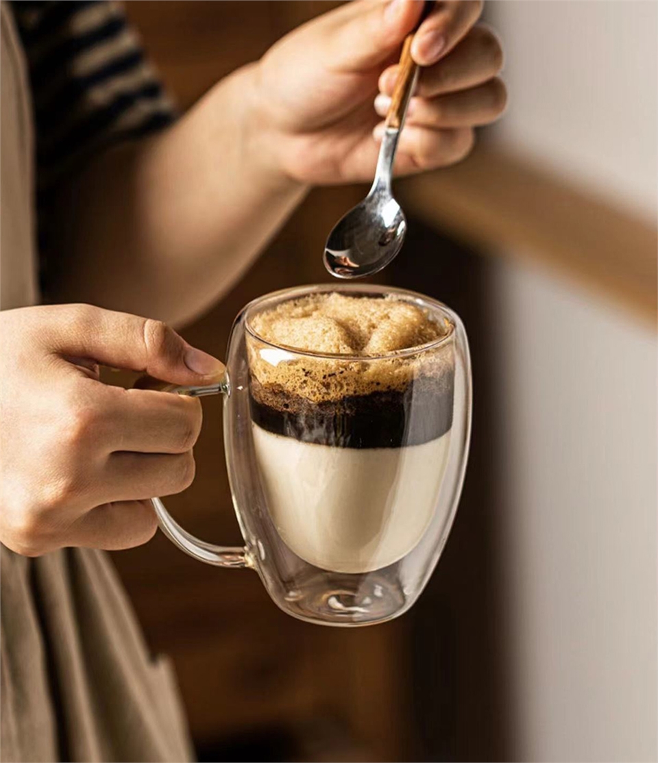 可盛裝熱飲或冷飲,此款玻璃杯具有隔熱與隔冷效果,裝熱茶或咖啡時不燙手,裝冰飲時玻璃杯外不會起水滴導致手滑。