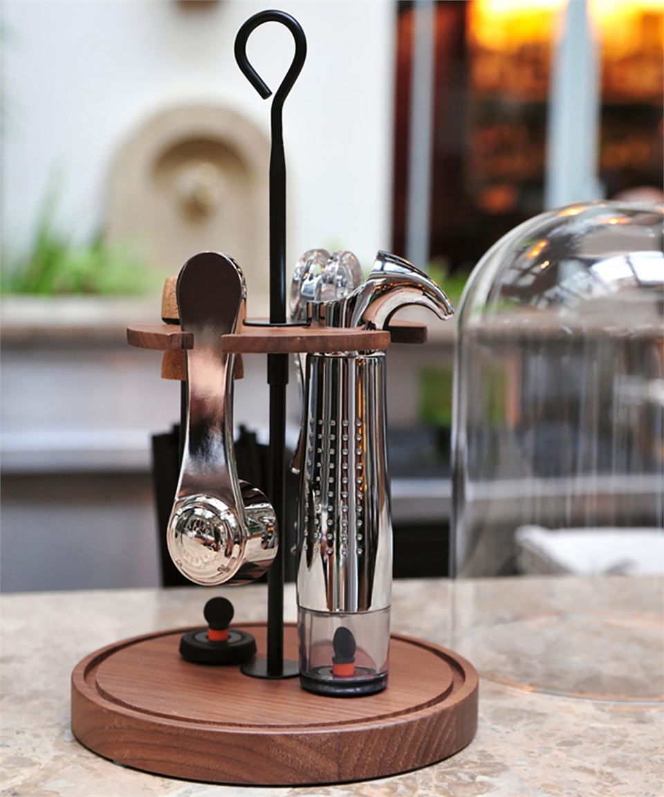 精美的核桃木底座以及堅硬耐刮的柔美弧形玻璃罩內放了五種最重要的酒具,只要帶著著它,到任何場合都適用。上方有一個把手,方便攜帶。