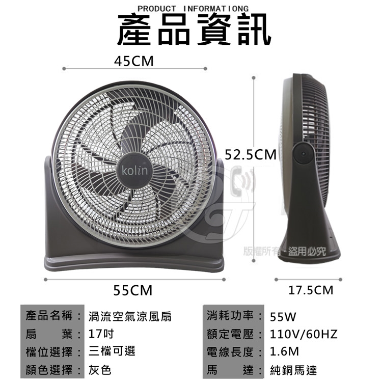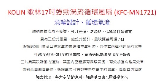 ◎品名:KOLIN 歌林17吋強勁渦流循環風扇 (KFC-MN1721)