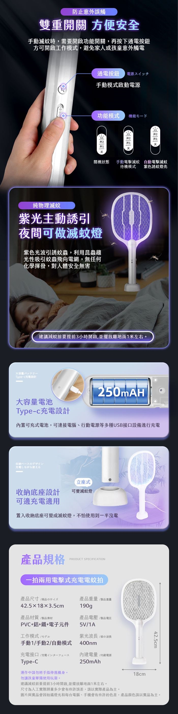 欲先將電蚊拍充電後,將蚊拍伸縮至適當位置,開啟主電源即可按押電擊按鈕電擊蚊蟲。