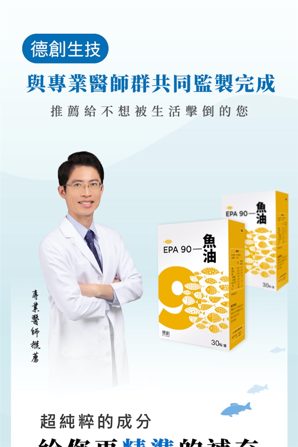 隨著臨床數據與科技發展,技術突破已可純化單方的EPA高濃度魚油,德創生技優先推出,滿足對90%EPA及一日需攝取量達2000mg的民眾,達到專注補充,事半功倍的優點。