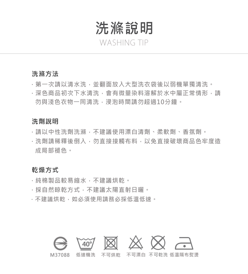 .清潔4:純棉製品較容易縮水,洗滌後請用風乾或陰乾,避免烈日曬太陽或使用高溫烘乾。