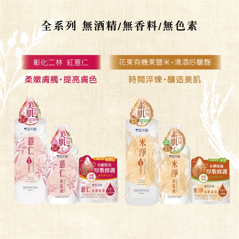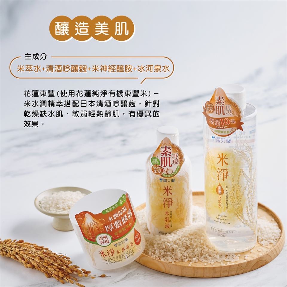 取自台灣在地花蓮“有機東豐米”萃取出美肌精華;搭配含豐富美膚酵母的“清酒吟釀麴”使肌膚柔亮細緻,持續使用可呈現柔嫩的健康素肌。