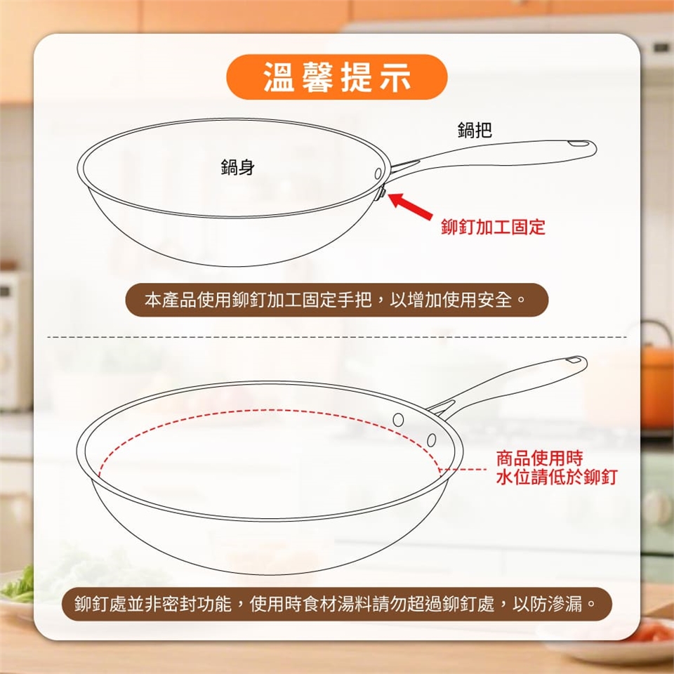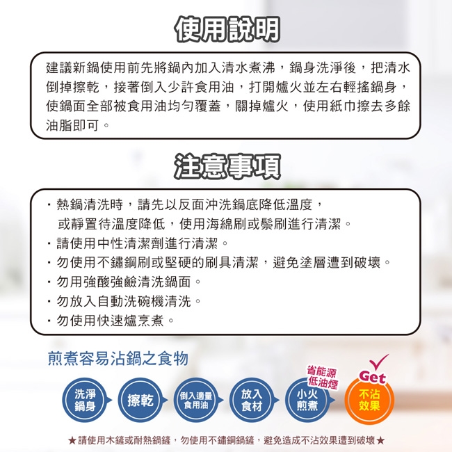 1.不可使用金屬鏟具及洗具,亦避免炒硬殼類食材,避免破壞塗層。