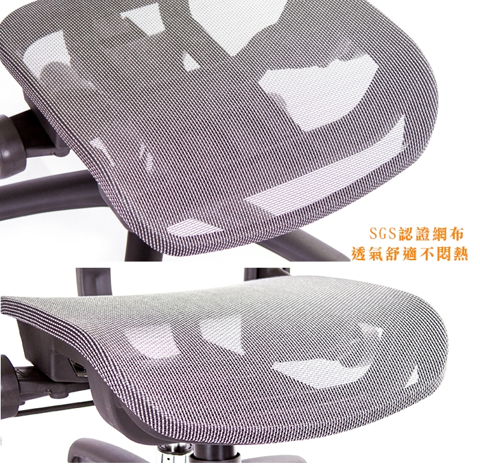 『座墊』採用國際SGS認證尼龍網布,全網透氣的材質,能讓臀部久座不悶熱,全網座墊使用日本技術繃法,採用三反折手工編織,讓坐墊能使用5~6年以上都不易鬆垮,尼龍絲編製的全網,不吸水的特性,不易髒汙,整理清潔都相當方便。