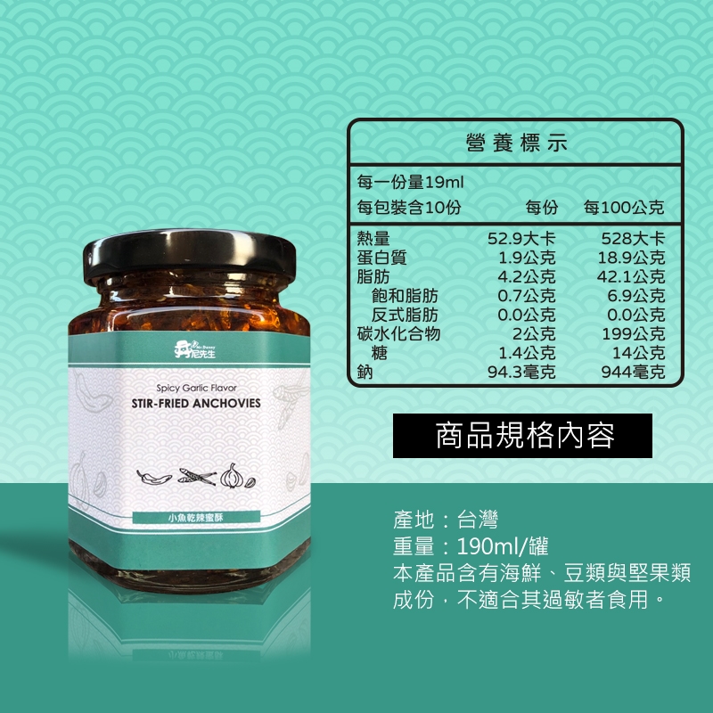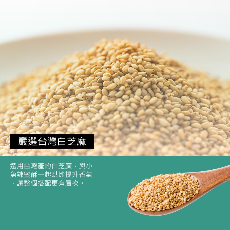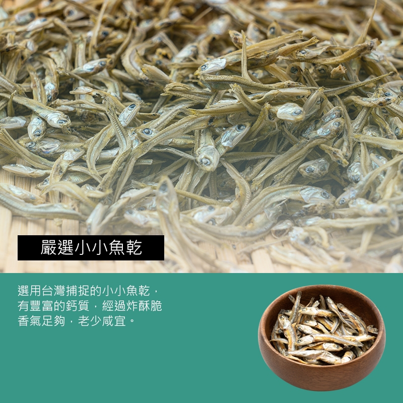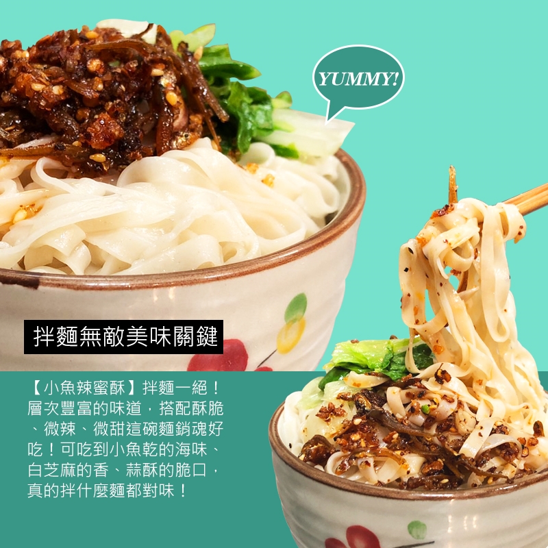 特別選用台灣小小魚乾、蒜酥、白芝麻與糖一起烘炒入味,香氣豐富有層次,拌麵配飯絕對美味無敵升級!