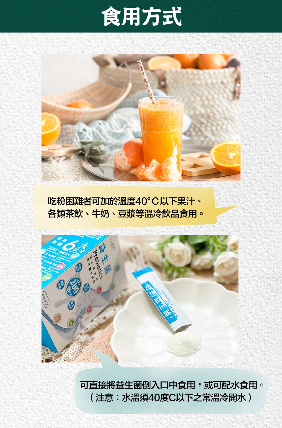 每日1-2包,最佳時間為餐後1小時食用可達到產品最佳作用,並搭配150-250c.c.常溫開水食用(水溫必須40℃以下)