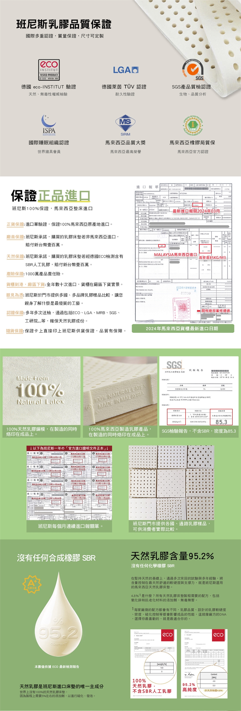-【馬來原廠送檢德國ECO檢測膠含量內為100%天然乳膠( NR=Natural Rubber )、0%合成乳膠(SBR)】