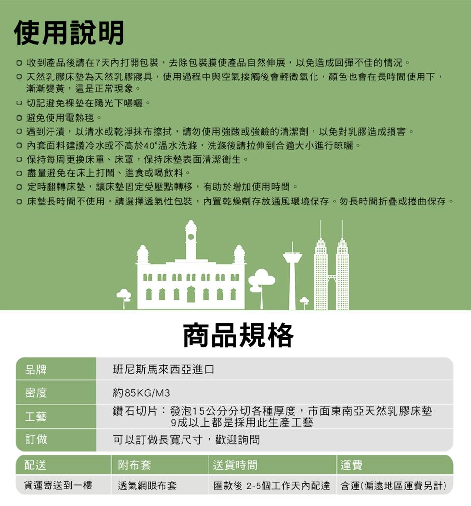備註 | 請支持班尼斯精品、班尼斯給您最好的品質 本款不需組裝,拆開即可使用。 本款統一由貨運寄送到一樓,無搬運上樓服務。 本款為【乳膠床】販售~不含照片上的配件、擺飾以及其他傢飾輔助品。 |