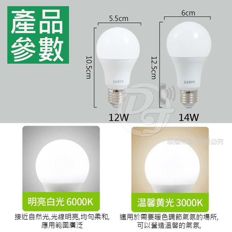 ◎品名:SAMPO聲寶 14W白光/黃光LED節能燈泡 (6入)