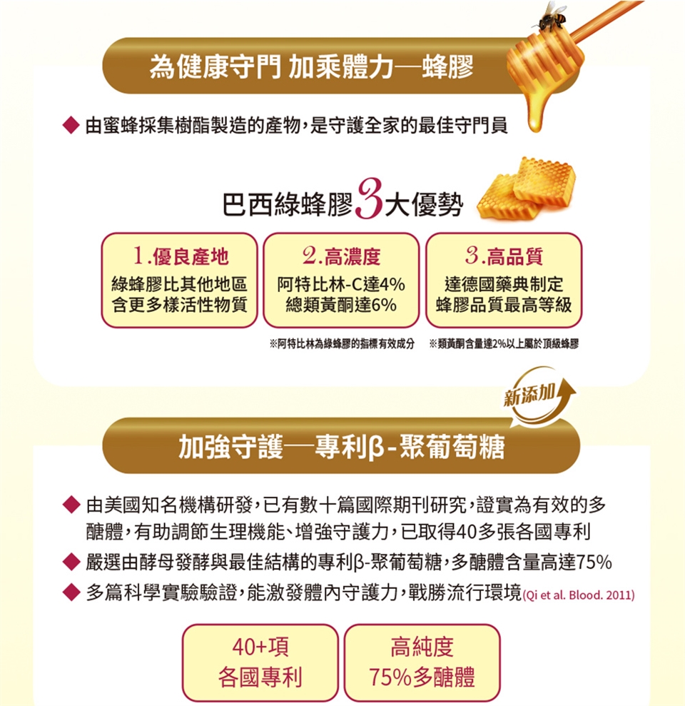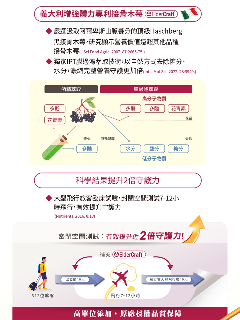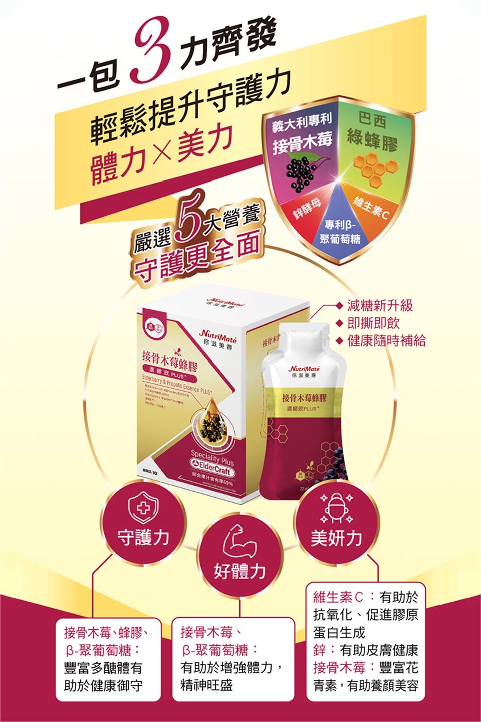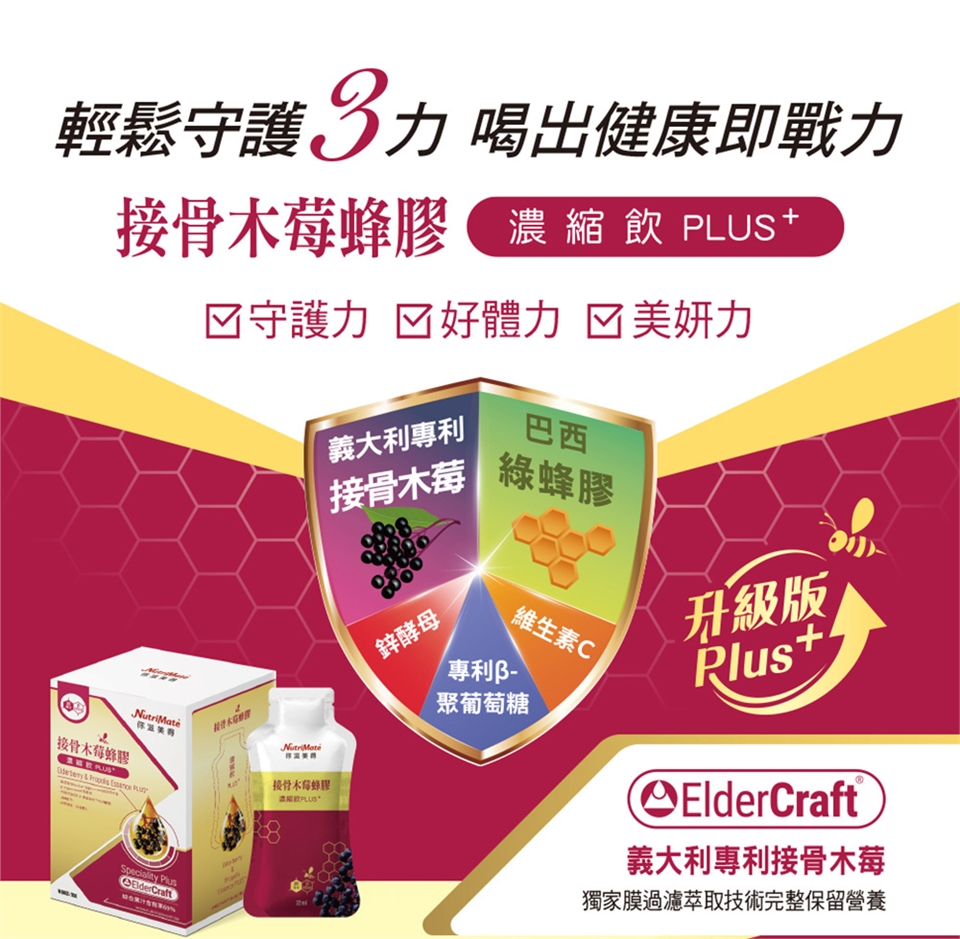 接骨木莓是您最佳守護力高效夥伴!嚴選義大利專利接骨木莓功效,以獨家膜過濾技術萃取,天然營養完整保留,更搭配頂級巴西綠蜂膠,定量蜂膠功效成分,接骨木莓+蜂膠+鋅酵母+ β-聚葡萄糖+維生素C功效加成,減糖62%守護力更升級!