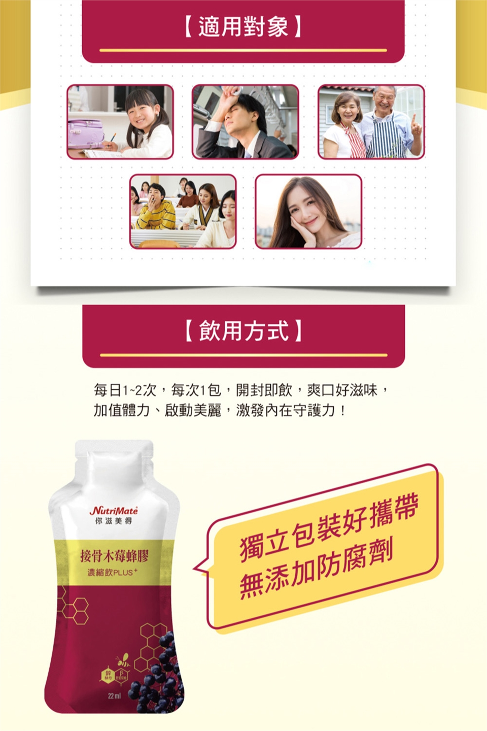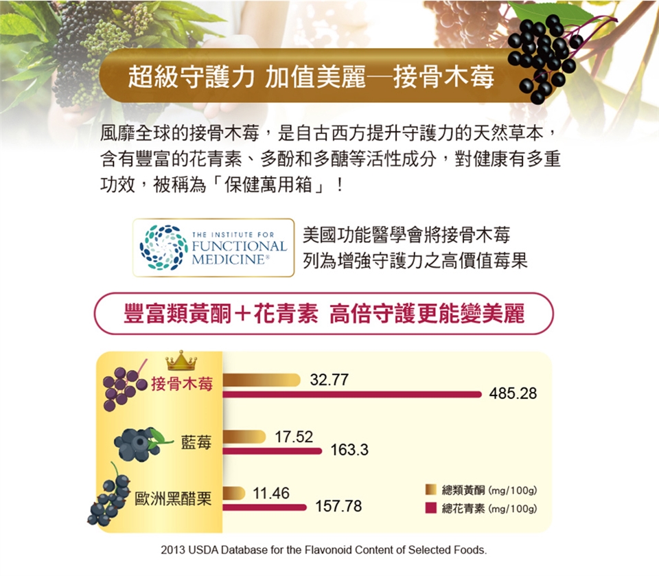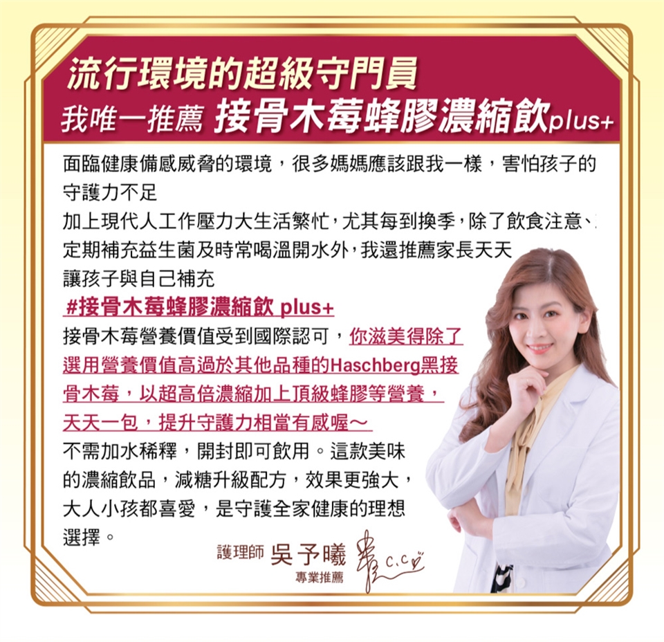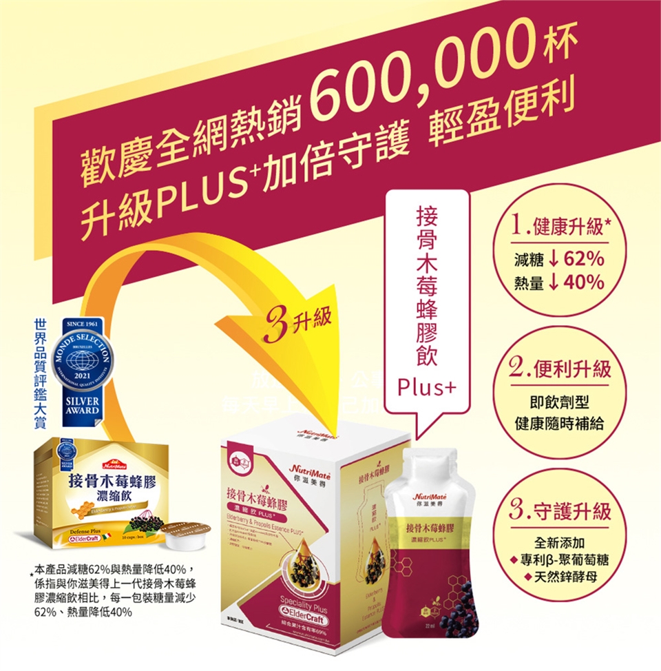 接骨木莓是您最佳守護力高效夥伴!嚴選義大利專利接骨木莓功效,以獨家膜過濾技術萃取,天然營養完整保留,更搭配頂級巴西綠蜂膠,定量蜂膠功效成分,接骨木莓+蜂膠+鋅酵母+ β-聚葡萄糖+維生素C功效加成,減糖62%守護力更升級!