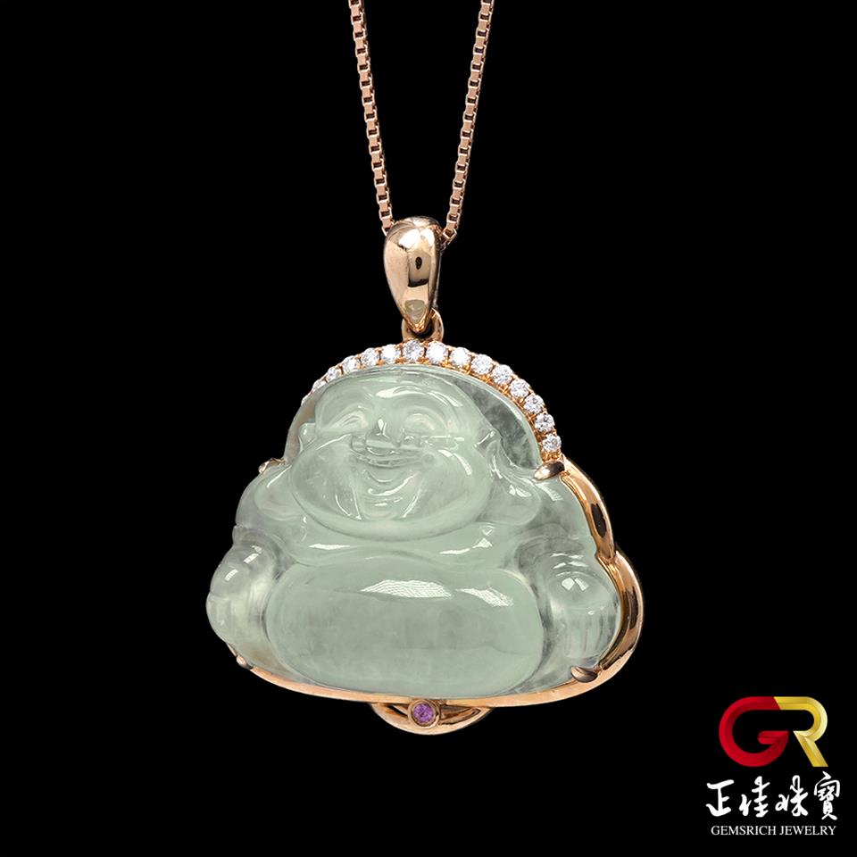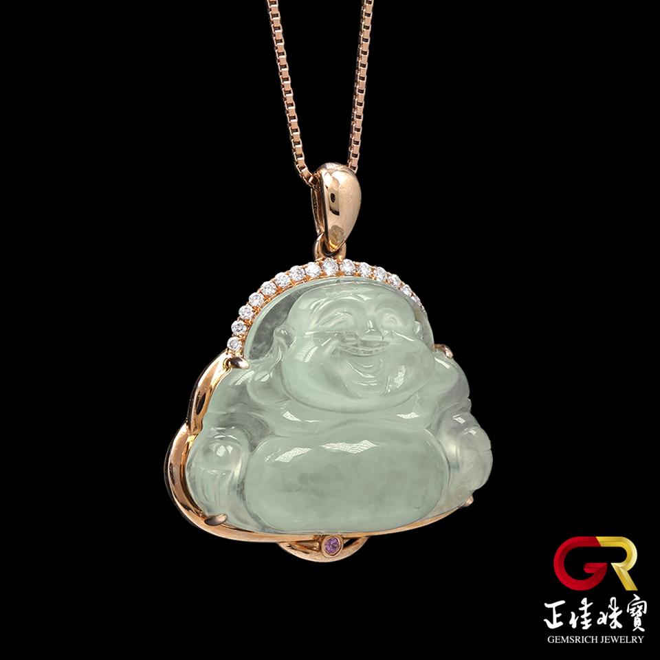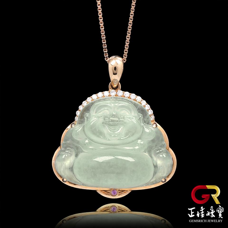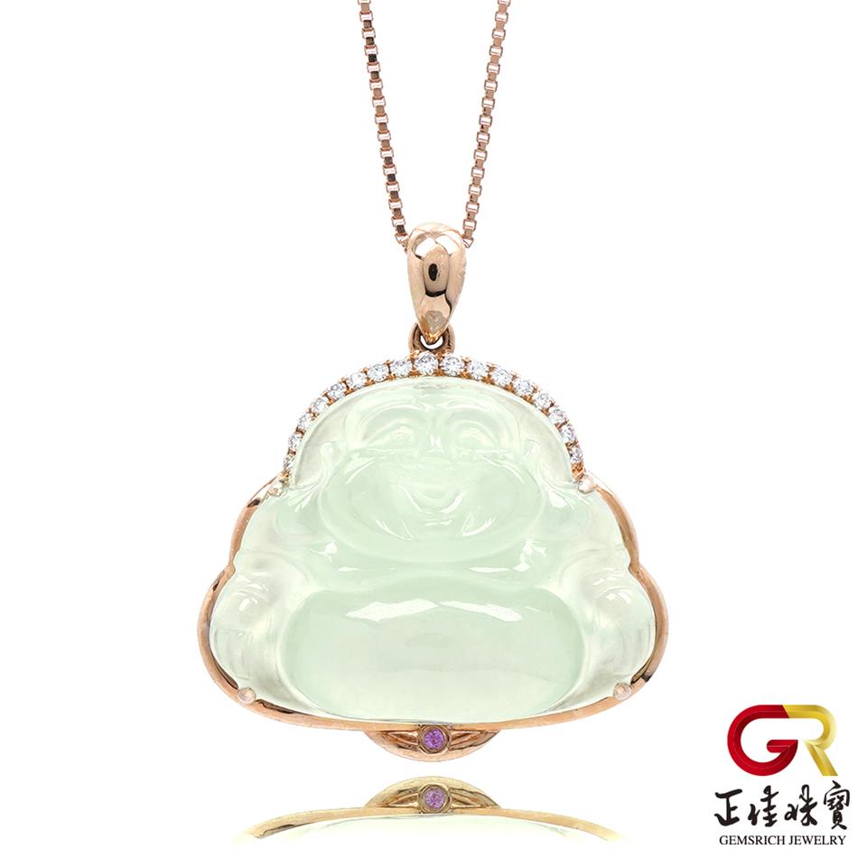 主角:翡翠 冰玻璃種大肚佛吊墜 4.3g 彌勒佛吊墜 天然A貨翡翠吊墜|18K金鑽石鑲嵌台 (附贈925銀項鍊)