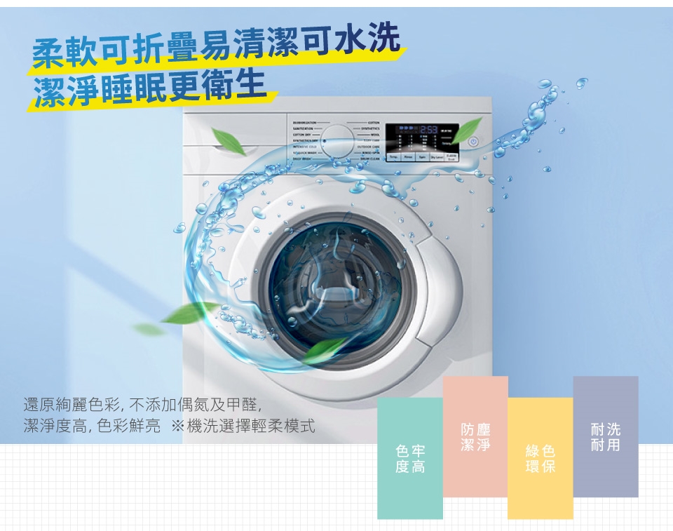 可水洗/不可烘乾/不可漂白/勿使用強力漂白清潔劑/浸泡時間請勿超過20分鐘/建議可放入大型洗衣袋後再清洗(因深色布料請勿使用含漂白劑之洗劑,盡量避免浸泡,深淺色寢具請分開清洗) 請使用寢具專用洗衣袋清洗